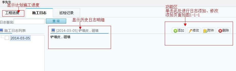 開工后的工程項(xiàng)目就流轉(zhuǎn)到在建工程中,在這一塊是對施工期間的工作做記錄和監(jiān)督操作,一般由項(xiàng)目監(jiān)理、施工人員或者項(xiàng)目經(jīng)理操作。 1.一次進(jìn)入菜單:工程管理→我的工程→在建工程界面(如下圖所示) 單擊工程名稱,添加施工日志、監(jiān)理日志 單擊“竣工”,對完工的項(xiàng)目進(jìn)行操作