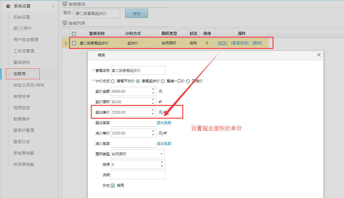 注(完成上述的設(shè)置后,將系統(tǒng)退出重新登錄。然后進入:定額庫——》套餐定額 ——》設(shè)置 )