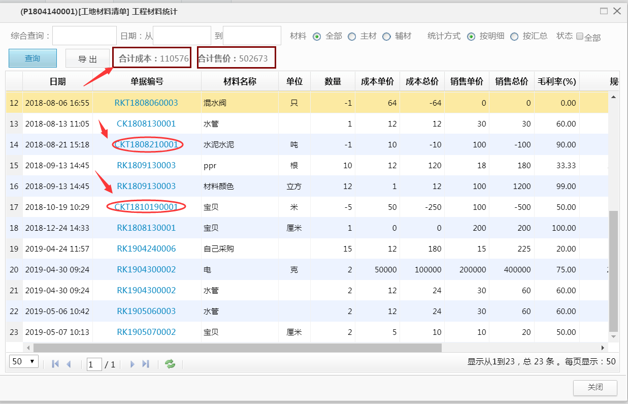 2、工地材料清單可查看所有用料數(shù)量及金額,另外也將退貨材料一一顯示,自動計算成本總價及銷售單價,針對每個工程的具體材料情況作出統(tǒng)計分析