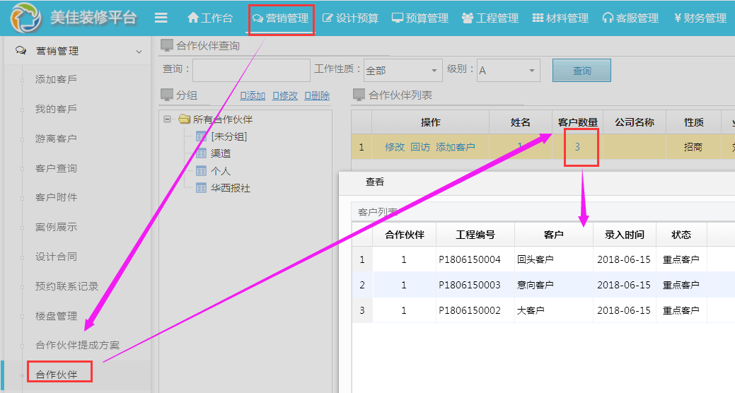 “合作伙伴 ” 作為裝修公司的戰(zhàn)略伙伴,是實(shí)現(xiàn)共贏的必備條件之一。近期美佳技術(shù)針對客戶提出的這一需求加班加點(diǎn)的開發(fā)了相關(guān)功能,具體內(nèi)容大家動(dòng)動(dòng)手指往下拉哦?。。?/strong>