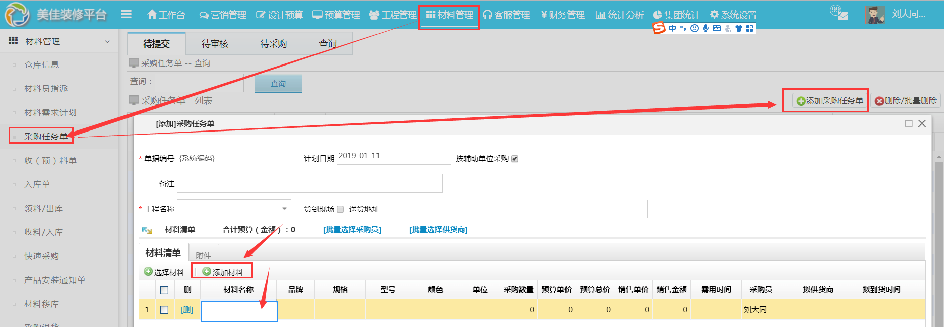 第二步驟:通過【材料管理】--【采購任務(wù)單】--【添加材料】完成自定義材料的添加
