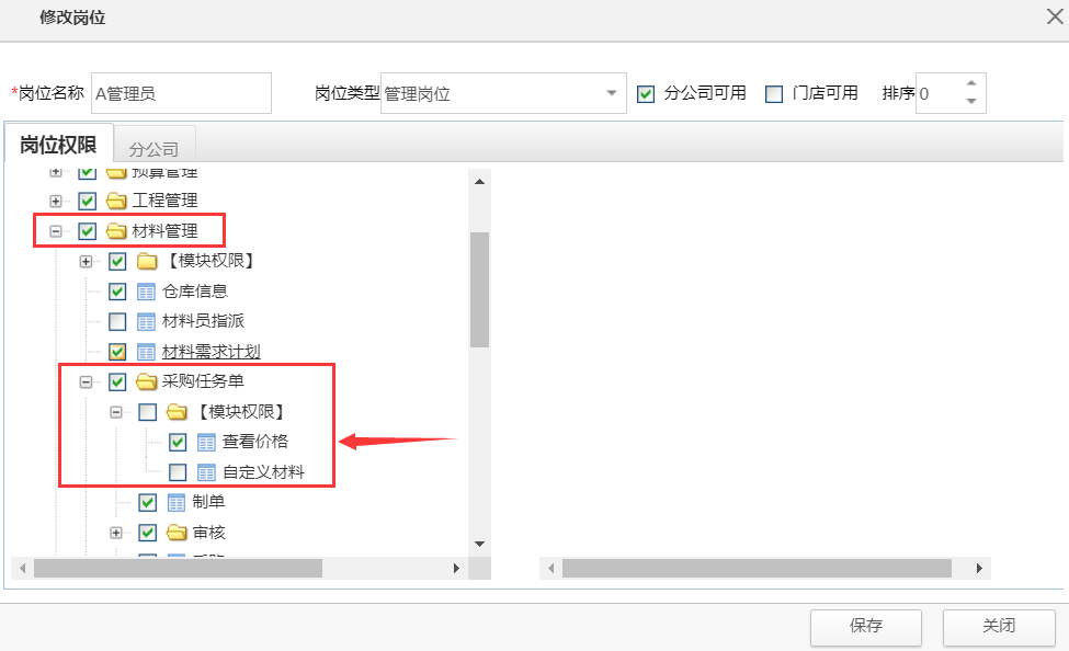 第一步驟:通過崗位權(quán)限將采購任務(wù)單可自定義添加材料的功能開通
