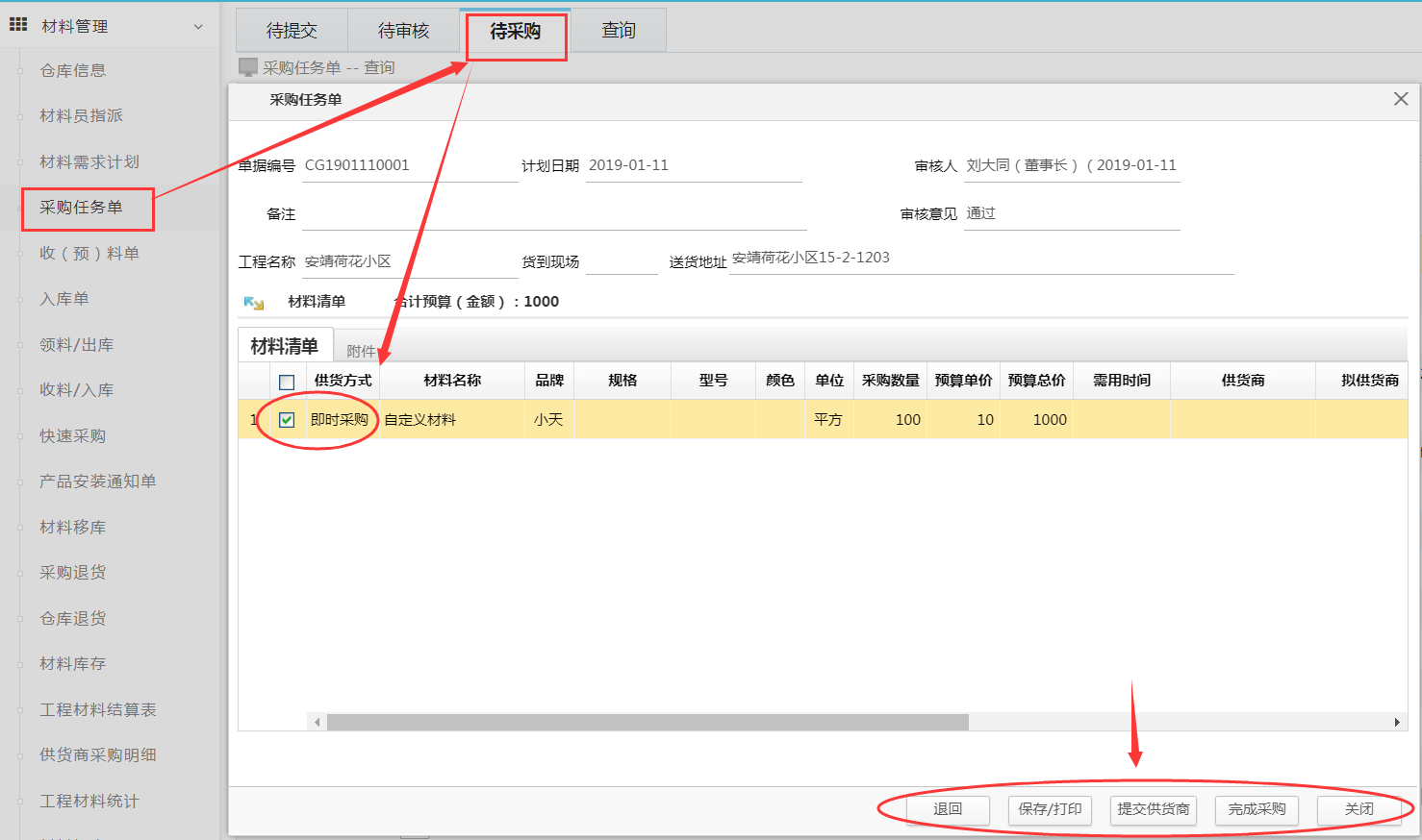 注意:采購任務(wù)單自定義添加的材料只能貨到現(xiàn)場,無法直接入倉庫,因為定額庫未維護進去庫存系統(tǒng)無法識別