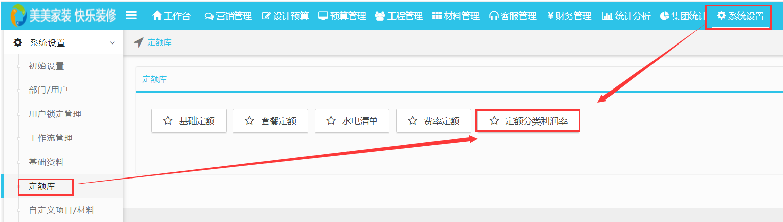 2、依次點(diǎn)擊系統(tǒng)設(shè)置--定額庫--定額分類利潤率