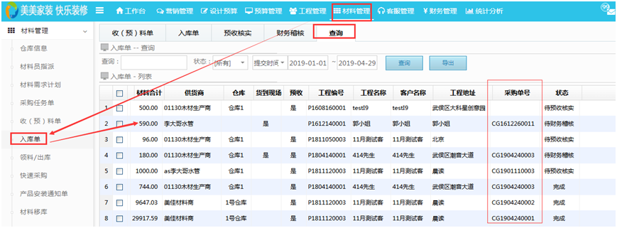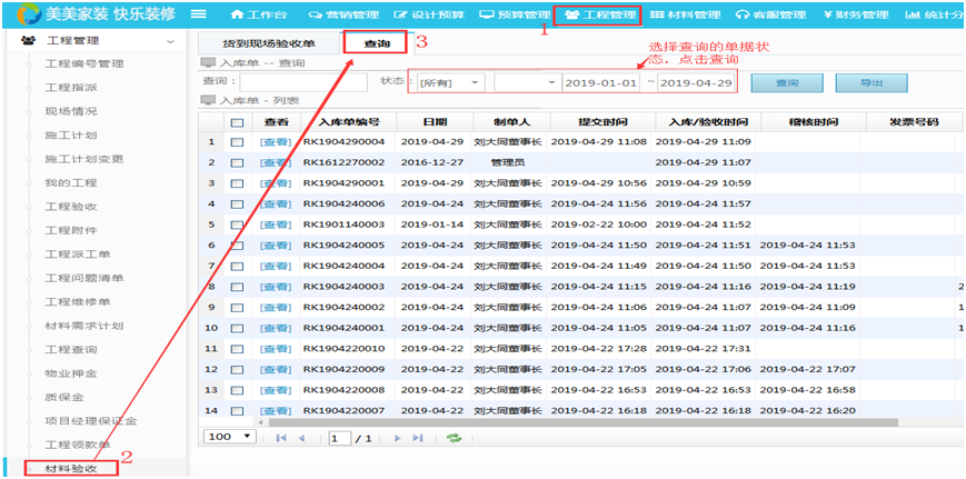 【工程管理】—》【材料驗(yàn)收】—》【查詢】