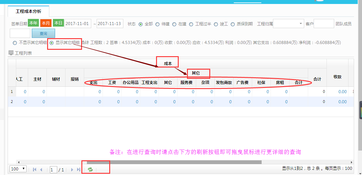 1、打開【統(tǒng)計(jì)分析】--【工程成本分析】顯示為不顯示其他明細(xì)