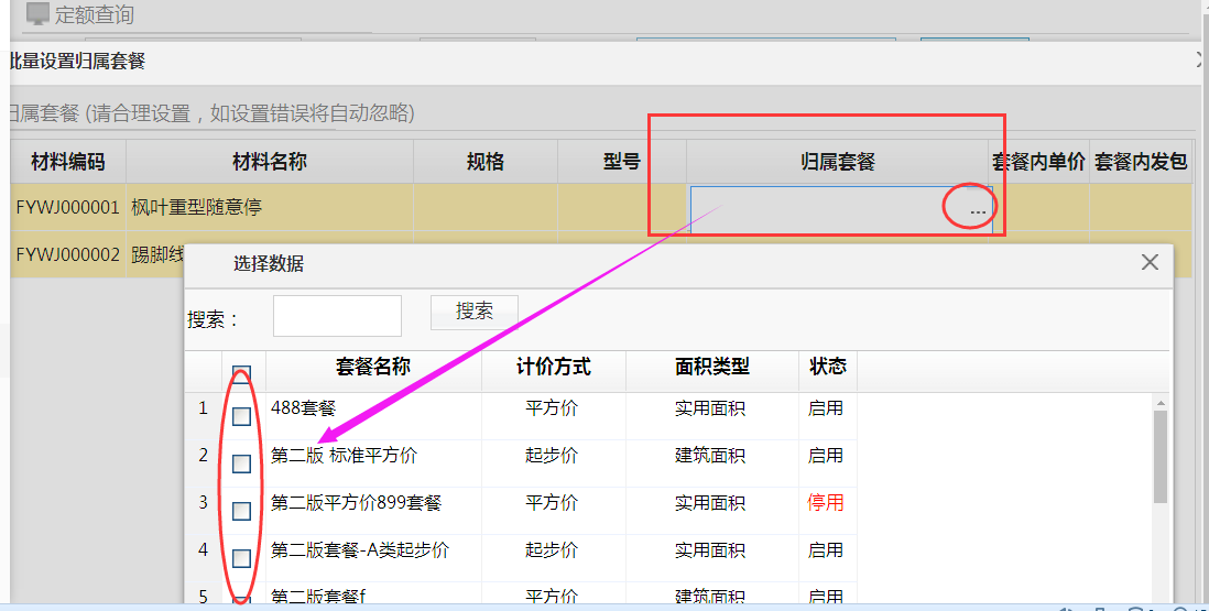 2:在彈出的新界面歸屬套餐下將選中的材料可手動(dòng)選擇多個(gè)套餐
