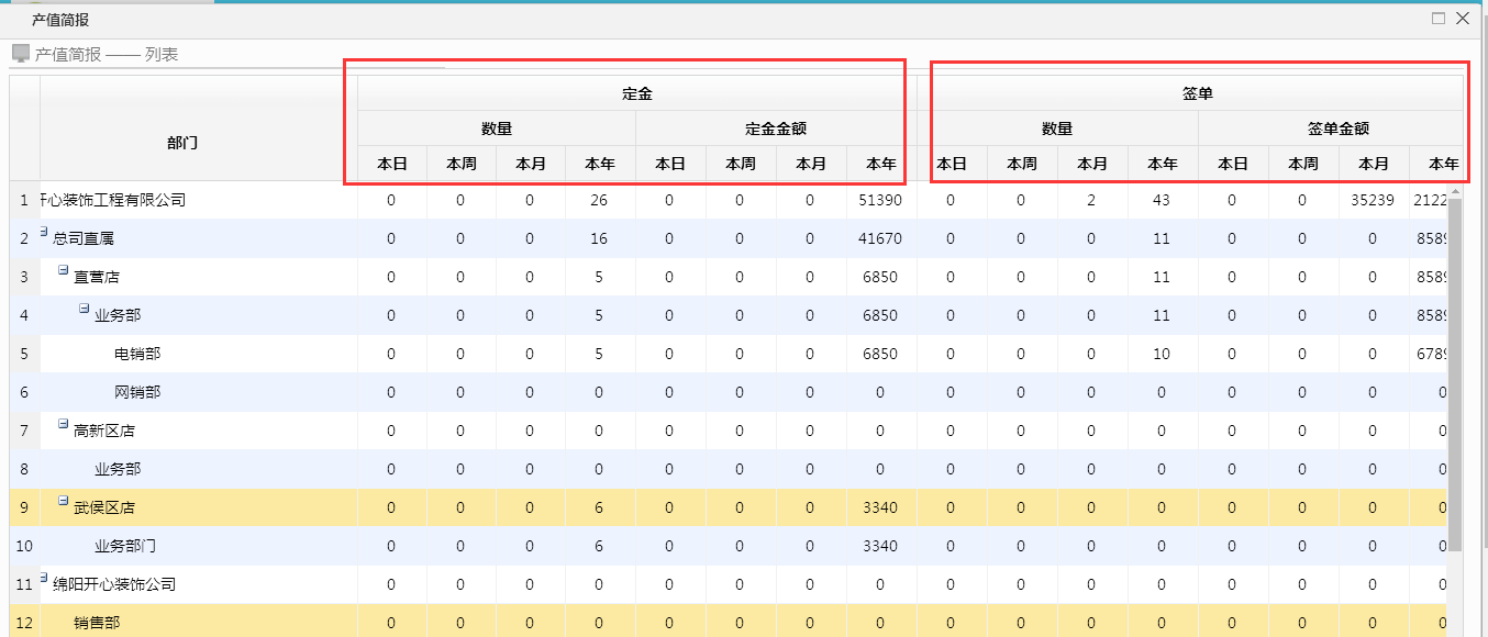 2:在此簡(jiǎn)報(bào)中可直觀的查詢各部門業(yè)務(wù)員在各個(gè)時(shí)間段簽約客戶的定金和簽單匯總數(shù)量和總金額