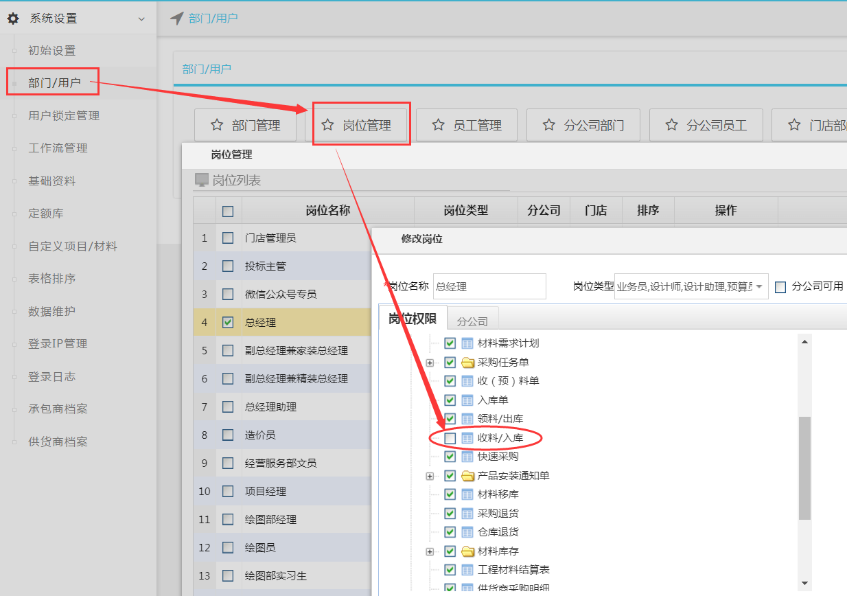 第一步驟:系統(tǒng)設(shè)置---部門用戶---崗位管理(開通收料/入庫的權(quán)限)
