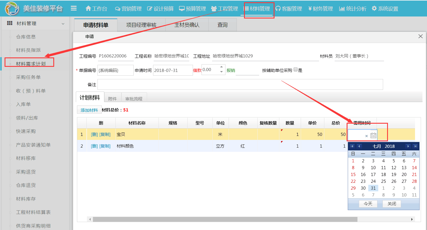 工地所需材料是否按時提供直接影響整個工期的進(jìn)度,為達(dá)到所需材料及時完成采購,系統(tǒng)優(yōu)化了材料提醒功能,這樣采購員或是相關(guān)的負(fù)責(zé)人就可收到材料需求預(yù)警通知,具體操作如下所示: