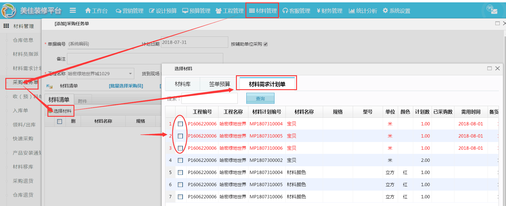 1、根據(jù)需求計(jì)劃中的需用時間在采購任務(wù)單【選擇材料】—【材料需求計(jì)劃單】將急需采購的材料標(biāo)注為紅色;