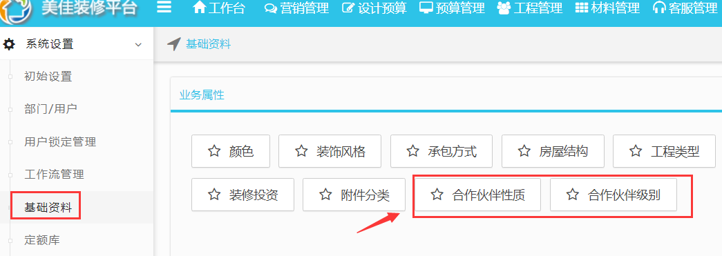【注意】首先選擇內(nèi)容在【基礎(chǔ)信息】—業(yè)務(wù)屬性:增加合作伙伴性質(zhì)、合作伙伴等級(jí)完善后方可在營銷管理--合作伙伴添加完成;